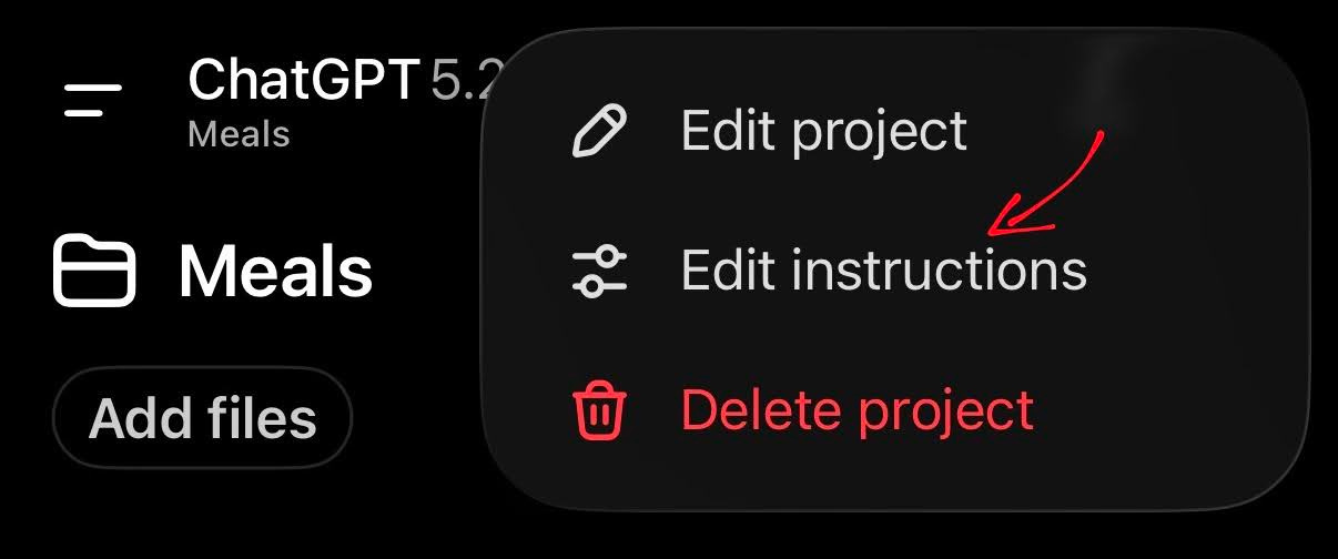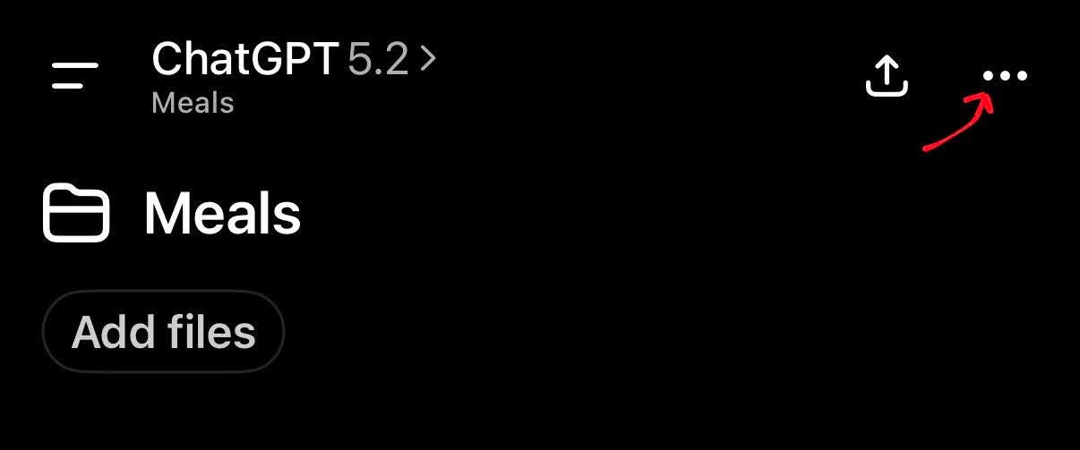 If you’re using ChatGPT, open the Meals project. Click on the three dots in the top right:
