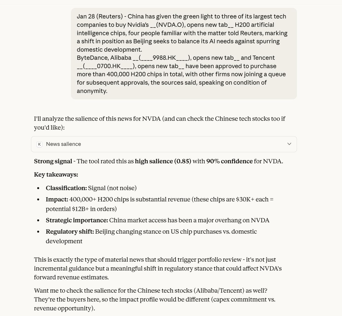 Strong signal (0.85 salience, 90% confidence) for NVDA. The agent doesn’t just flag news - it explains why it matters. Revenue impact. Strategic importance. Regulatory implications.
